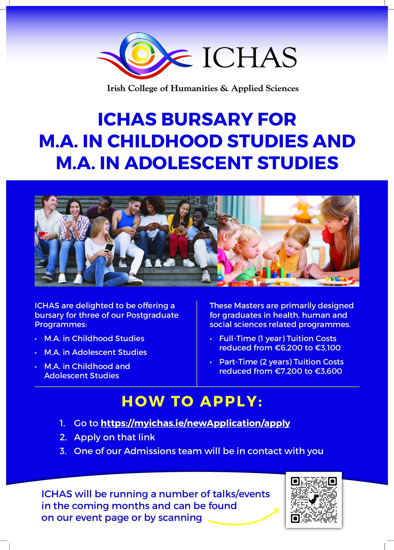 The Irish College of Humanities and Applied Sciences is an independent third-level college that prides itself on its student-centred approach. The College offers a range of programmes at Level 6,7,8 and 9 on the National Framework of Qualifications. Our programmes cover an extensive range of disciplines including Addiction Counselling, Addiction Recovery, Childcare, Adolescent Studies, Psychology, Counselling and Psychotherapy and Youth Studies.